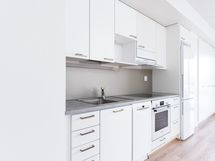 Keittiössä on valkoiset kaapistot ja tummansävyinen työtaso. Vakiovarusteisiin kuuluvat kalusteuuni, keraaminen liesitaso, jääkaappipakastin sekä arkea sujuvoittava astianpesukone.