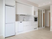 Keittiöiden kiinteisiin kodinkoneisiin kuuluvat induktioliesi, kalusteuuni ja astianpesukone. Mikroaaltouunille on tilavaraus ja työtaso on helppohoitoista laminaattia. Keittiön välitila on tyylikästä kuviolaminaattia.