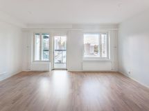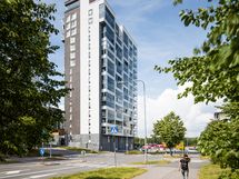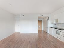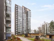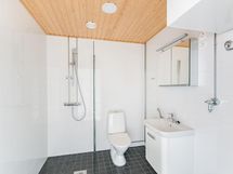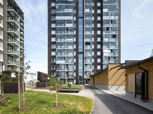 The shared facilities for resident include a sauna and club rooms on the top floor with balconies for cooling off, laundry and drying rooms located on the two lowest floors and apartment specific storage unit. There is also an outdoor storage space and bike storage in the yard area. The apartments have high-quality surface materials. The floor material in the living areas is light oak parquet and the bathrooms have a dark tile floor. There is a mirror cabinet in the bathroom, as well as space for a washing machine. The kitchen is equipped with a ceramic stove, fridge-freezer, and a dishwasher. The kitchen cabinets are white, and the worktops are dark. The windows of the apartments have blinds, and the balconies are glazed. The bathroom floors have comfort heating connected to the apartment's electricity.