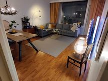 Valoisa kaksio, jossa kaikki huoneet ovat todella tilavia ja esimerkiksi olohuoneeseen mahtuu hienosti myös kuuden hengen ruokailuryhmä. Lisäksi oma sauna antaa mukavaa luksusta. Lasitetulle parvekkeelle paistaa mukavasti ilta-aurinko (lounas) ja sieltä avautuu näkymät vehreään sisäpihaan, jossa myös asukkaiden vapaassa käytössä oleva grillikatos.