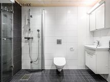 Asunnossa tilava kylpyhuone ja siistit, vaaleat pintamateriaaliratkaisut.