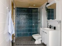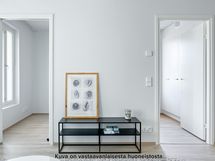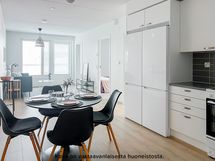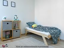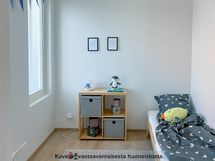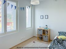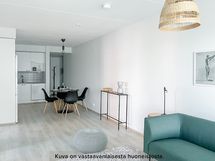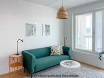 Viihtyisä ja tilava kolmio rakennuksen neljännessä kerroksessa. Asunnon erillisestä eteisestä löytyy valmiina säilytystilaa. Kylpyhuone on eteisen yhteydessä. Kylpyhuoneessa on liitos- ja tilavaraukset pyykinpesukoneelle tai pesutornille sekä asunnon oma sauna. Kulmakeittiö on tilavan olohuoneen yhteydessä. Keittiön varustukseen kuuluu keraaminen lattialiesi, astianpesukone, kaksi jääkaappipakastinta sekä erillinen tilavaraus mikrolle. Asunnon helmi on sen lasitettu parveke, joka toimii samalla myös lisätilana. Molemmista huoneiston makuuhuoneista löytyy valmiina kaappitilaa. Asuintiloissa on laminaattilattiat ja kylpy- ja wc-tiloissa puolestaan laattalattiat. Asunnossa on neutraalinsävyiset pintamateriaalit, joiden pohjalta on helppo rakentaa omannäköinen sisustus. Sälekaihtimet ikkunoissa lisäävät asumismukavuutta.
