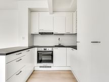 - Liesi: induktio, erillisuuni. Työtasot: laminaatti. Kylmäsäilytys: jääkaappi, pakastin. Varustus: liesituuletin, mikroaaltouuni, astianpesukone. Keittiöiden kiintokalusteet ovat kotimaisia vakiokalusteita.