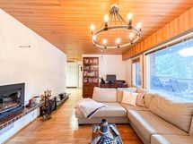 Olohuone on valoisa ja tilava. Takka ei ole käytössä, mutta toimii hyvin tunnelmanluojana ja on kiva lisä sisustuksessa.