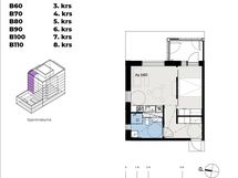The eight-floor building has one and two-bedroom apartments with smart layouts for rent. The apartments combine light-colored materials to create bright and spacious living spaces. The kitchen is equipped with an integrated dishwasher, oven, induction hob and fridge-freezer combination. The tiled bathrooms have space for a washing machine and tumble dryer.
