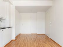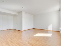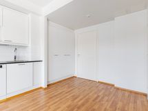 Asunnon seinäpinnat ovat valkoiset ja lattiassa on laminaatti.