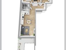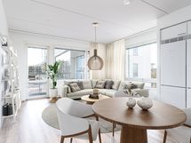Kahdeksannen kerroksen tilava neliö lasitetulla terassilla. Asunto on laadukkaasti varusteltu tyylikkäillä materiaaleilla, kodinkoneilla ja käytännöllisillä säilytysratkaisuilla. Vaaleat pintamateriaalit antavat asunnolle valoisan yleisilmeen yhdessä sisään tulvivan luonnonvalon kanssa. Asunnon moderni avokeittiö avautuu olohuoneeseen, josta on käynti lasitulle terassille. Lasitettu terassi tuo mukavasti lisää oleskelutilaa.