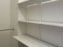 Huoneessa ja keittiössä pintamateriaaleina on vaaleaksi maalatut seinät ja lattiassa vaalea tammilaminaatti. Eteisessä on kaapistoja ja vaatehuoneessa on runsaasti säilytystilaa.