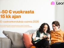 Vuokraetu! Tässä Leona-kodissa säästät -50€ vuokrasta 15 kuukauden ajan, kun sitoudut vähintään vuoden mittaiseen asumiseen. Lisäksi asut samalla vuokralla vuoden 2026 loppuun asti. Tee tästä uusi kotisi! Etu koskee vain uusia sopimuksia.