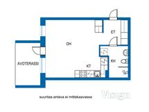 Huoneen keskeltä on käynti omalle avoterassille. Hyvin varustellun avokeittiön varusteluihin kuuluvat mm. astianpesukone ja keraaminen liesi. Säilytystilaa löytyy eteisen sekä huoneen kaapistoista. Kylpyhuoneeseen saa hyvin mahtumaan oman pyykinpesukoneen.