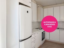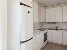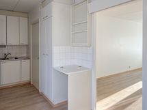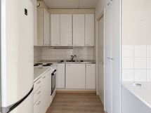 Asunnon toimiva pohjaratkaisu tekee arjesta sujuvaa. Keittiön vieressä on käytännöllinen ruokailutila, johon mahtuu näppärästi ruokapöytä. Valoisa olohuone jatkuu lasitetulle parvekkeelle, joka tarjoaa ylimääräistä tilaa rentoutumiseen. Lattiassa on laminaatti ja seinät ovat maalatut. Keittiön ilmettä täydentävät valkoiset kaapistot metallivetimillä. Kylpyhuoneessa on osittain laatoitetut ja osittain tapetoidut seinät sekä muovimatto. Tilaan saa asennettua oman pyykinpesukoneen.