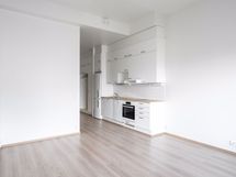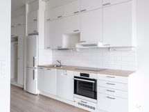 Kodissa on vaalea, moneen tyyliin sopiva värimaailma. Seinät ovat maalatut ja lattiassa on tammensävyinen laminaatti. Keittotilan kaapistot ovat valkoiset, välitilassa on valkoinen laatta ja työtasona on lämpimän puun sävyinen laminaatti. Keittotilan varusteina löytyvät induktioliesitaso, kalusteuuni, liesikupu, astianpesukone sekä jääkaappipakastin.