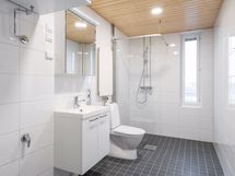 Kylpyhuoneessa on harmaa lattialaatta ja seinät ovat valkoista laattaa. Peilikaapista ja altaan alla olevasta allaskalusteesta purkit ja purnukat löytävät omat paikkansa. Kylpyhuoneessa on tilavaraus ja liitäntä pyykinpesukoneelle. Kylpyhuoneesta löytyy myös ikkuna, josta saa luonnonvaloa tilaan.
