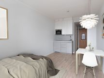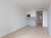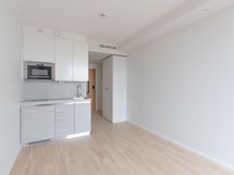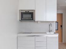 Arkea sujuvoittavat keittotila, joka sisältää keraamisen liesitason, jääkaapin pienellä pakastinlokerolla sekä integroidun mikroaaltouunin. Kylpyhuoneesta löytyy lattialämmitys. Vaikka ikkunat ovatkin ihanan suuret, kuuluu niihin myös sälekaihtimet, joilla voit säädellä valon kulkua asuntoon. Ikkunat eivät ole avattavissa, mutta huoneistoissa on keskitetty ilmanvaihto, jota tarvittaessa pystyy tehostamaankin kerralla aina viiteen tuntiin saakka.