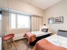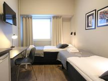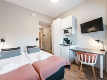 This double room is equipped with high-quality facilities for business travellers. In addition to good beds, the room has a TV, fridge, microwave, kettle and dishes. The room is comfortably furnished for even the most demanding tastes. The bathroom is compact and equipped with high-quality materials. Food preparation and laundry are done in the common areas, in addition to which the necessary cleaning supplies can be found in the common cleaning closets.
