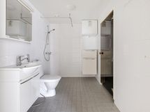 Tilavassa kylpyhuoneessa on lattialämmitys ja sinne mahtuu hyvin pesukone tai pesutorni. Pyykit pyykinpesuaineineen mahtuu kätevästi pyykkikaappiin.