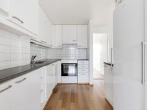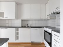 Kodin lattia on laminaattia ja pinnat ovat muutenkin miellyttävät ja laadukkaat. Avokeittiössä on tilaa työskennellä ja sen varustukseen kuuluu keraaminen liesi, liesikupu, jääkaappi, pakastin ja astianpesukone arkea helpottamaan. Mahdolliselle mikrolle löytyy oma paikkansa yläkaapistosta eli se ei vie erikseen pöytätilaa.