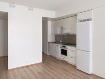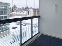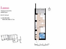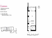Tässä Lumo-kodissa on yhdelle pitkälle seinustalle sijoittuvat niin eteisen vaatesäilytys, keittiö kuin vaatekaapit. Näin ollen toinen seinusta jää kokonaan vapaaseen käyttöön, mikä helpottaa asunnon sisustamista. Keskelle sijoitettu, reunoiltaan avoin seinä, jakaa huonetilaa vaikkapa alkoviksi tai työtilatilaksi. Asunnon päädystä on käynti lasitetulle parvekkeelle, joka avautuu korttelin sisäpihan suuntaan.