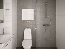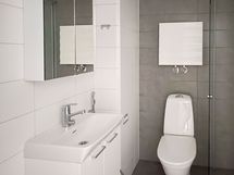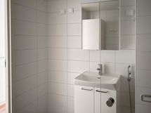 Eteisen yhteyteen jäävässä kylpyhuoneessa on valkoiset ja harmaat laatat. Allaskaapissa ja peilikaapissa on hyvin säilytystilaa ja tilavaraus omalle pyykinpesukoneelle löytyy tietenkin.