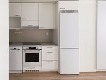 Keittiö on raikkaan vaalea. Kaapistot ovat valkoiset, työpöytätaso on betonia jäljittelevää laminaattia ja välitilan sisustuslevy on tyylikkään shampanjan sävyinen. Varustukseen kuuluu keraaminen liesitaso, erillinen kalusteuuni, astianpesukone sekä jääpakastinkaappi.