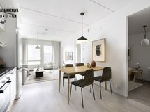 The living room floors are laminate, the walls are painted, and the bathrooms are tiled. The kitchens are equipped with a fridge-freezer, a built-in oven, or in smaller apartments, a floor stove, a ceramic cooktop and a dishwasher. The bathrooms have connections and space for a washing machine and electric comfort floor heating. Some apartments have glassed-in balconies and some have Juliet balconies.