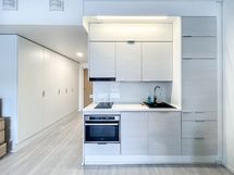 Asunnon vaaleat pinnat yhdistettynä isoihin ikkunoihin ja parvekemaiseen ranskalaiseen parvekkeeseen, joka on suoraan talon rauhalliselle pihalle. Avokeittiö on varustettu moderneilla integroiduilla kodinkoneilla, jonka ansiosta keittiö onkin kuin osa muuta sisustusta. Kylpyhuone jatkaa asunnon muuta kaunista ja toimivaa linjaa. Kylpyhuoneesta löytyy myös pyykinpesukone.