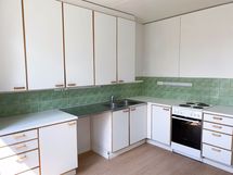 Kodissa on laminaatti lattia. Keittiössä on valkoiset kaapistot puureunuksilla ja vihreät välitilan laatat. Keittiössä ei ole liesituuletinta. Kylpyhuoneessa on sininen muovimattolattia ja pyykinpesukoneelle löytyy liitännät. Kylpyhuoneessa on amme.