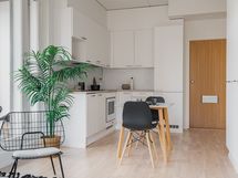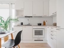 Tilaa isolle ruokapöydälle, Paljon kaappitilaa, Laminaattitasot, Astianpesukone, Liesi tai uuni erikseen, Liesikupu, Keraaminen liesi, Jää-pakastinkaappi