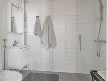 Suihku, Suihkuseinä, Pesukonevalmius, Peilikaappi, Allaskaappi, Laattalattia, Laattaseinä, Lattialämmitys