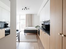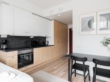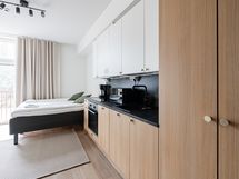 Studiosta valmiina löytyy sänky, pöytä ja tuolit, valaistus, keittiön perustasoiset kodinkoneet, sekä astianpesukone. Keittiö on kevyesti varusteltu. Liinavaatteet kuuluvat jokaiseen huoneistoon. Large- koon huoneistoihin kuuluu sängyn lisäksi sohva. Huomioittehan, että ilmoituksen kuvat eivät välttämättä ole kyseisestä asunnosta, joten asunto ja ilmoituksen kuvat voivat poiketa toisistaan.