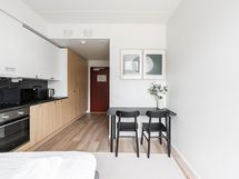 Tarjoamme kalustetun asunnon normaalilla vuokratasolla. Studion lisäksi sinulla on vapaassa käytössä upeat yhteistilamme, eli kuntosali, saunaosasto, kirjasto, sekä yhteiskeittiö.