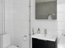 - Pesutilojen kuvaus: Kylpyhuoneessa on varustuksena wc-istuin, bideesuihku, suihku, suihkuseinä, pesuallas, allaskaappi, peilikaappi ja pesukoneliitäntä. Sähkökäyttöinen mukavuuslattialämmitys. Lattia on laattaa, seinät kaakelia.