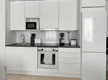- Avokeittiössä on varustuksena kiertoilmauuni, keraaminen liesitaso, astianpesukone sekä jääkaappipakastin. Työtaso on laminaattia, lattia on parkettia.