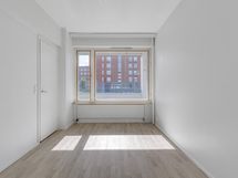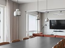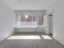 Olohuoneeseen mahtuu hyvin ruokapöytä sekä muut huonekalut. Olohuoneesta käynti lasitetulla parvekkeelle sekä keittiöön.