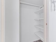 The bedroom is generously sized and offers ample storage thanks to additional cabinets and a walk-in wardrobe.