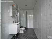 Mustavalkoisen kylpyhuoneen seinät ovat kiiltävän valkoista laattaa. Lattia on laatoitettu kuusikulmaisella, mattamustalla klinkkerilaatalla. Pyykinpesukoneelle ja kuivausrummulle on varaus.