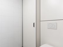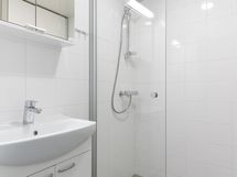 Moderni, tyylikkäästi laatoitettu kylpyhuone tarjoaa säilytystilaa peilikaapin, allaslaatikoston ansiosta. Kääntyvä suihkuseinä sekä varaus pyykinpesukoneelle viimeistelevät tilan käytännöllisyyden.