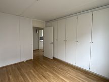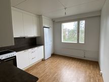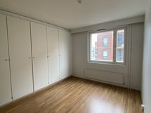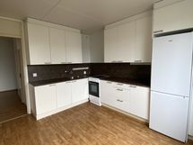 Keittiö on käytännöllinen ja siisti, varusteltuna keraamisella liedellä, valkoisilla kaapistoilla, tyylikkäillä tummilla laminaattitasoilla sekä jääkaappi-pakastimella. Makuuhuoneessa on runsaasti säilytystilaa kaapistojen ansiosta.