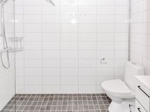 Kylpyhuoneen kalusteet ovat ovat SATOlle suunniteltua, kotimaista Kide-mallistoa ja väriltään valkoiset. Kylpyhuoneen seinät ovat valkoista laattaa ja lattian laatoitus on tumman harmaa. Kylpyhuoneessa on myös varaus pesukoneelle ja kuivausrummulle.