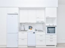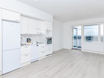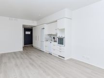 Kompaktissa yksiössä on näppärä avokeittiö, kaappitilaa eteisessä ja jokainen neliö hyötykäytössä. Kodin pintamateriaalit ovat ajattoman kauniita ja vaaleat sävyt toimivat neutraalina pohjana mille tahansa sisustustyylille. Avokeittiössä on raikkaan valkoiset kaapinovet ja marmorikuosiset laminaattitasot. Keittiön varustukseen kuuluu keraaminen liesitaso, kalusteuuni, astianpesukone ja kylmälaitteet sekä varaus mikroaaltouunille.