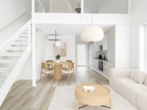 Asunnoissa on tyylikäs vinyylilattia, keittiössä joko vaalea kaapisto tummalla laminaattitasolla ja mustilla vetimillä tai tumma kaapisto vaalealla tasolla ja kuparinvärisillä vetimillä. Kylpyhuoneessa harmaa laatoitus, suihkuseinä ja varaus pesukoneelle. Isot ikkunat tekevät asunnosta avaran ja viihtyisän. Kaikissa taloissa on myös omat pihat.