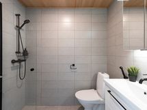 Kylpyhuoneessa harmaa laatoitus, suihkuseinä ja varaus pesukoneelle.