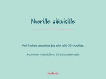 - Nuorisoasunto, asuntoa voi hakea vain alle 30-vuotiaat nuoret aikuiset ja asunnossa voi asua kunnes täyttää 35 vuotta