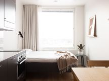 This fully furnished studio comes with a 140 cm wide bed, table and chairs, cabins, lighting, basic appliances, textiles and small household items. The combination of kitchen and bedroom with bathroom is a functional and cozy space where you can relax at your leisure time. The studio is pet-friendly.