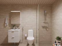 Kylpyhuoneessa on käytetty raikkaita ja tyylikkäitä materiaaleja, jotka sopivat moneen makuun. Tila on laatoitettu kauttaaltaan sävykkäillä kermanvaaleilla laatoilla. Kattoa koristaa vaalea puupanelointi. Kylpyhuoneesta löytyy myös tilavaraus pyykinpesukoneelle.