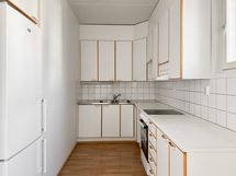 Tässä valoisassa kaksiossa on kaunis tammilaminaatti ja suuret ikkunat, jotka tuovat runsaasti luonnonvaloa asuntoon. Keittiössä on valkoiset kaapit puureunuksin sekä valkoinen työtaso, jotka luovat raikkaan kokonaisuuden. Kylpyhuoneessa on tumman ja valkoisen kaakelin yhdistelmä sekä liitännät pyykinpesukoneelle. Asuntoa täydentää oma sauna, joka tuo arkeen ripauksen luksusta.