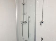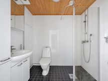 Eteisessä sijaitsevat peilikaapit tuovat käytännöllistä säilytystilaa. Tilavassa kylpyhuoneessa on harmaa laattalattia, valkoiset laattaseinät, suihkuseinä sekä paikka pyykinpesukoneelle.
