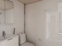 Kokonaisuus on moderni ja tyylikäs. Lattia on vaalean puun sävyinen, ja kylpyhuoneessa on beige lattialaatta, valkoinen seinälaatta, lasinen suihkuseinä sekä liitännät pyykinpesukoneelle.