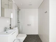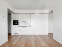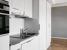 Vaalea keittiö harmaalla työtasolla on kompakti mutta toimiva, ja tarjoaa hyvin säilytystilaa. Varusteluun kuuluvat induktioliesi sekä integroitu astianpesukone, jotka tekevät arjesta sujuvaa. Kylpyhuone on viimeistelty tyylikkäästi harmaan ja valkoisen sävyillä, ja sieltä löytyy paikka pyykinpesukoneelle tai pesutornille sekä lasinen suihkuseinä.