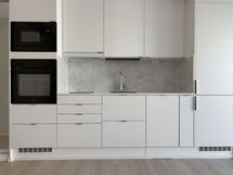 Keittotila on tyylikäs ja käytännöllinen, varustettuna induktioliedellä. Keittiön välitilaan on valittu tummaa tai vaaleaa marmoria jäljittelevä kuvio, joka elävöittää yleisilmettä ja tuo ripauksen näyttävyyttä.